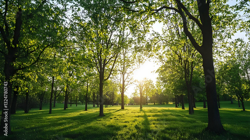© julio, Naklejka premium Lush Green Trees in Sunlight Casting Long Shadows on Grass with Bright Sunshine in Forest Park