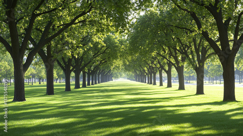© mingnimit, Fototapeta premium Lush green trees line serene pathway in park