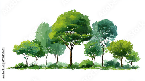 © Keopaserth, Fototapeta premium Lush green trees line simple horizon with varied foliage and grasses, peaceful natural landscape in watercolor style evoking calm and freshness