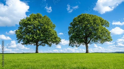 © aun, Fototapeta premium Lush Green Trees Under Bright Blue Sky With Fluffy White Clouds