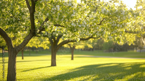 Naklejka premium Lush green trees with blooming flowers in sunny park