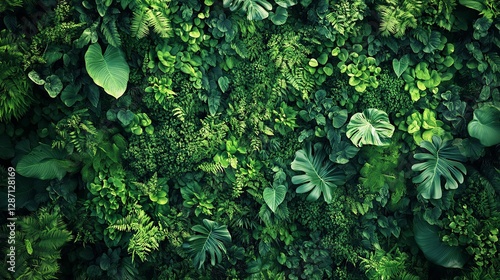 © Arieswanto, Fototapeta premium Lush Green Tropical Foliage Wall Background