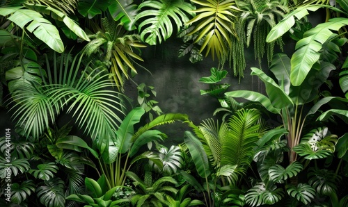 © Azril, Naklejka premium Lush green tropical foliage wall botanical jungle background for creative projects