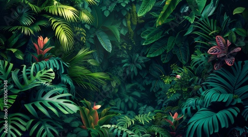 Fototapeta premium Lush green tropical foliage with vibrant red flowers in a dense jungle setting.