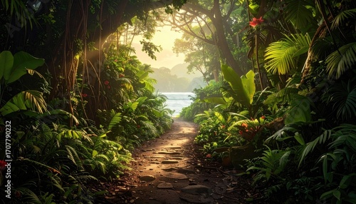 Fototapeta premium Lush Green Tropical Forest Path Leading to River with Sunlight Streaming...