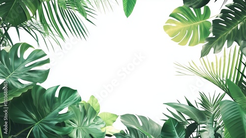 Naklejka premium Lush green tropical leaves arranged on a bright white background for a fresh and vibrant natural aesthetic