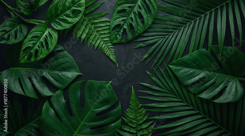 Obraz premium Lush Green Tropical Leaves Beautifully Arranged on a Dark Background