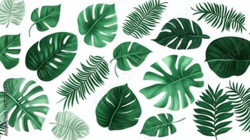 Fototapeta premium Lush Green Tropical Leaves Pattern Featuring Varied Shapes and Textures...