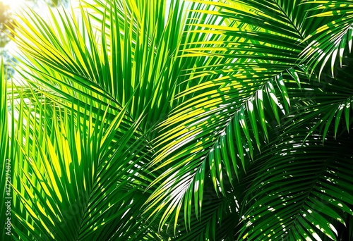 Obraz premium Lush green tropical palm leaves, sunlight dappled, jungle, design