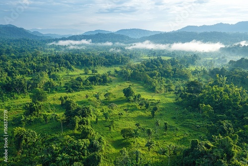 © SERHII, Obraz premium Lush green tropical rainforest landscape with rolling hills and misty clouds
