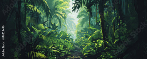 Naklejka premium Lush green tropical rainforest path with sunlight filtering through the canopy