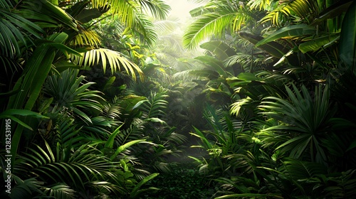 © Roni, Fototapeta premium Lush Green Tropical Rainforest with Sunlight Beams