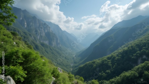 © Zoft Studio, Obraz premium Lush Green Valley in Mountainous Landscape Under Cloudy Sky, Montenegro