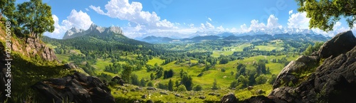 Fototapeta premium Lush Green Valley Landscape with Majestic Mountains and Blue Sky