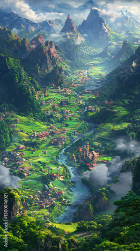 © tama, Obraz premium Lush Green Valley Landscape with Winding River and Mountain Peaks