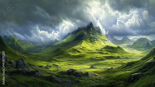 © Umi Sakina, Fototapeta premium Lush green valley nestled between dramatic mountains under a dramatic sky