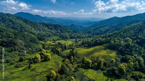 © Galih, Naklejka premium Lush green valley nestled between forested mountains under a partly cloudy sky