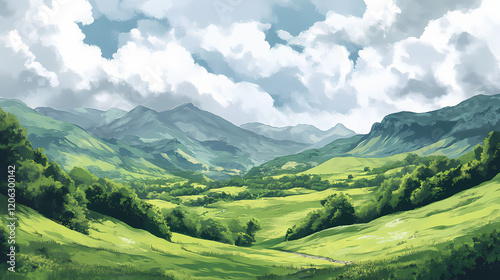 Fototapeta premium Lush green valley nestled between majestic mountains under a cloudy sky. Majestic Valley. Illustration