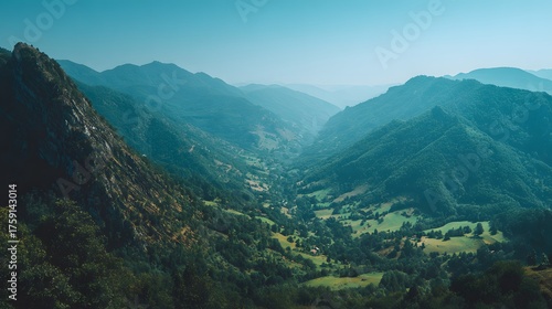 © Jojo*, Fototapeta premium Lush green valley nestled between misty mountain ranges under a clear sky.