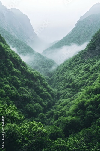 © BrandwayArt, Obraz premium Lush green valley shrouded in morning mist and clouds