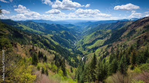Fototapeta premium Lush Green Valley Surrounded by Majestic Mountains Under a Bright Blue Sky with Fluffy White Clouds