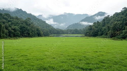 Fototapeta premium Lush green valley, tranquil lake, misty mountains. Background of calm serenity. Possible use in travel, nature, and environment-focused imagery