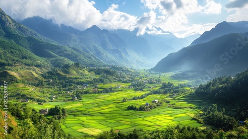 © Rere_Art151, Fototapeta premium Lush Green Valley Village Nestled Among Majestic Mountains