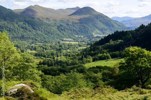 © senyumanmu, Obraz premium Lush green valley with forests and hills against a bright sky
