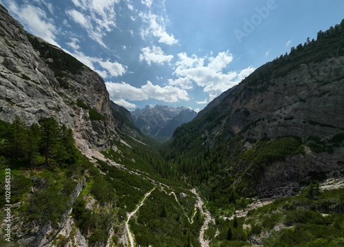 © Wirestock, Obraz premium Lush green valley with rocky mountains and a partly cloudy sky