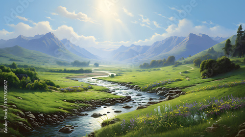 Fototapeta premium Lush Green Valley with Winding River and Sunlit Wildflowers