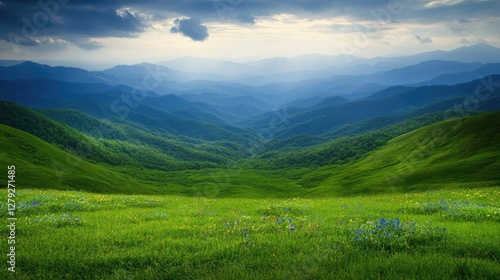© Dack, Fototapeta premium Lush green valleys stretch beneath moody sky, creating serene la