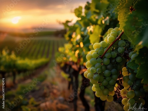 © Nawarit, Fototapeta premium Lush green vineyard in summer, serene and abundant, Botanical, Soft greens, Photograph, Wine country