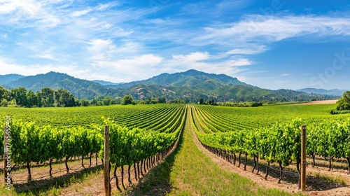 © ALIS ST, Fototapeta premium Lush Green Vineyard Landscape Under Bright Blue Sky with Mountain Background in Daylight