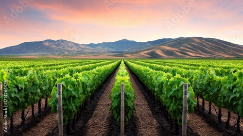 © Kanimalia, Fototapeta premium Lush Green Vineyard Rows at Sunset Mountain Landscape Wine Country