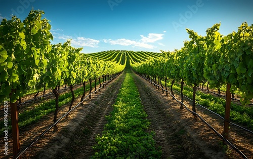 Naklejka premium Lush green vineyard rows stretching towards a sunlit hill under a vibrant...