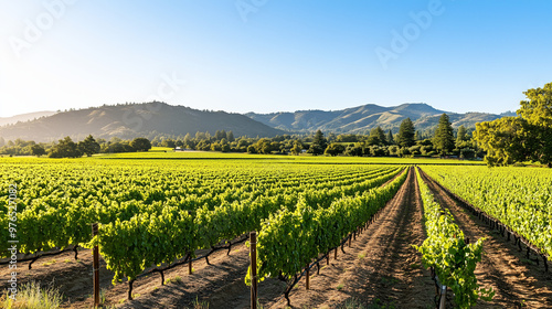 Fototapeta premium Lush green vineyard rows under a clear blue sky with scenic mountains in the...