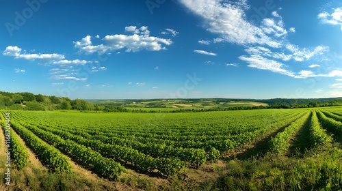 Fototapeta premium Lush Green Vineyard Under a Bright Sunny Sky