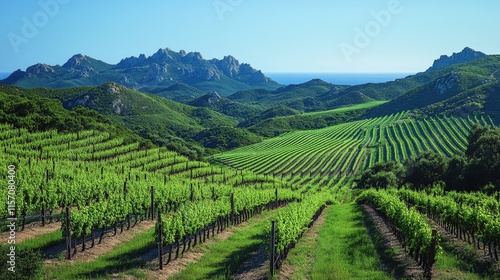 Fototapeta premium Lush green vineyards on rolling hills with mountains and ocean in background.