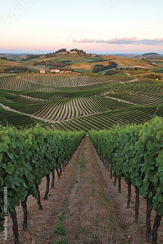 Fototapeta premium Lush green vineyards stretch across rolling hills at sunset, creating a...