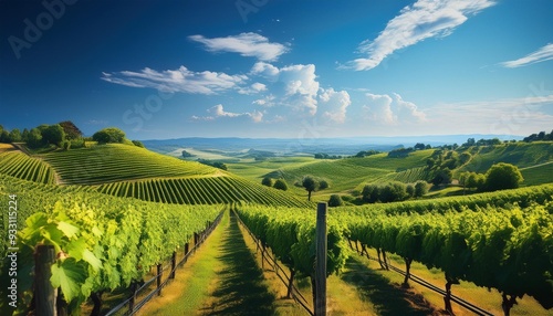 Fototapeta premium Lush green vineyards under a clear blue sky.