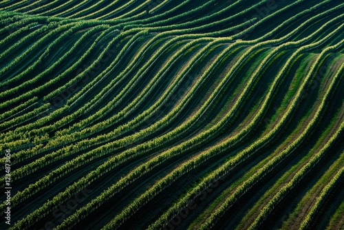 © mohdfaizal, Fototapeta premium Lush Green Vineyards with Curved Rows in Scenic Landscape
