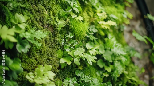 Fototapeta premium Lush green wall covered in diverse foliage.