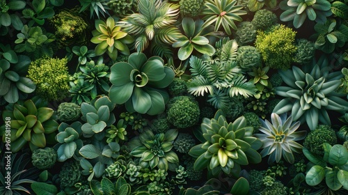 Fototapeta premium Lush green wall of diverse succulent plants thriving under soft natural light...