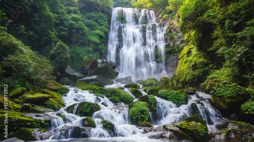 © Cornflakesei, Fototapeta premium Lush Green Waterfall in a Tropical Rainforest