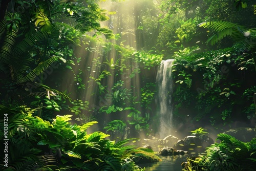 Obraz premium Lush Green Waterfall in Dense Tropical Rainforest with Sun Rays and Plants