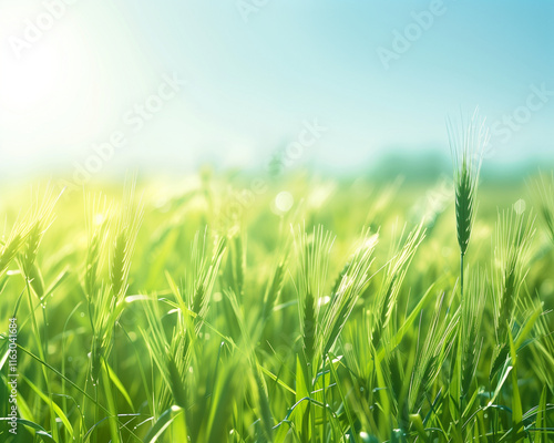 Fototapeta premium Lush Green Wheat Field in Sunlight - Perfect for Agricultural Themes and...