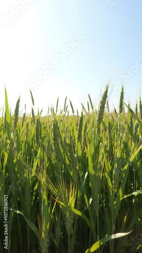 Obraz premium Lush green wheat field under bright sun on a clear sunny day, idyllic, sunlight