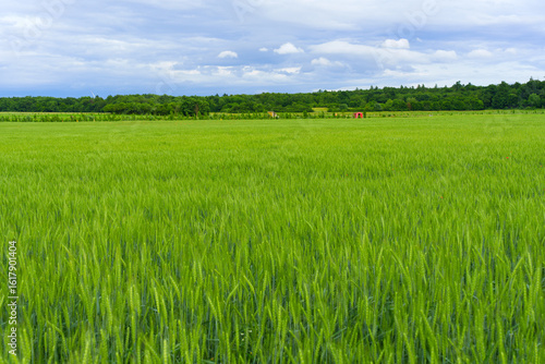 © Katie Chizhevskaya, Fototapeta premium Lush Green Wheat Field Under Dramatic Cloudy Skies