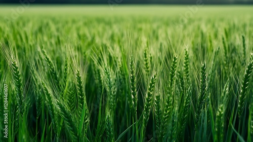 © Generative AI, Obraz premium Lush Green Wheat Field with Tall Stalks Swaying in the Gentle Breeze Under a Clear Blue Sky : Generative AI