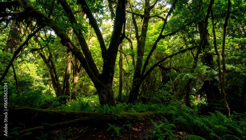 © Zakarya, Obraz premium Lush greenery and towering trees create a dense, verdant forest scene, bathed in dappled sunlight.
